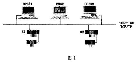 CYA一5000系统最显著特点就是稳定、可靠及其开放性和灵活性。为实现管控一体化,系统由一个工程师站、一个操作员站、两个现场控制站组成,工程师站用于集中管理监测l#、2#锅炉运行工况。操作员站用于完成监视处理系统1#,2#锅炉的热工参数,过程控制站用于数据采集和控制。系统结构如图1所示: