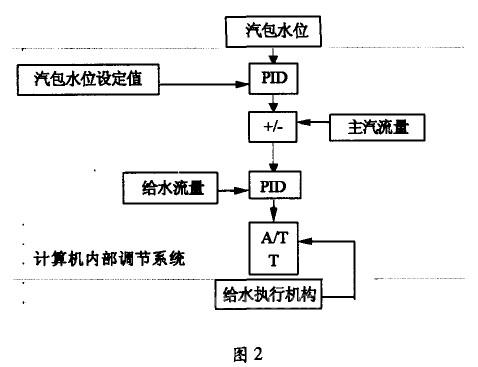 汽包水位控制回路采用串级三冲量控制。以汽包水位为主调节信号,蒸汽流量为前馈,给水流量为串级,采用智能PID控制(如图2所示)。可设定信号的滤波系数、控制周期、不控限、正负限幅、死区。稳态控制精度可达+10mm。