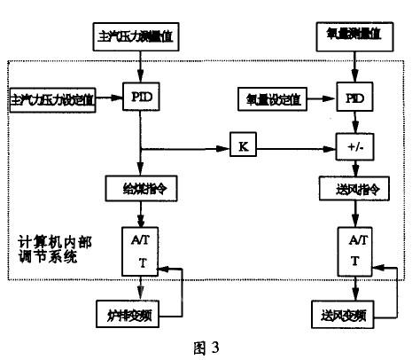 包括燃料调节、蒸汽压力调节、送风调节、炉膛负压调节。负压调节采用单回路,控制引风机转速来达到控制目的;以蒸汽压力作为被控参数来控制给煤,PID的运算结果给到以含氧量为被控参数控制送风的回路中,从而实现最优化燃烧控制(如图形所示)。