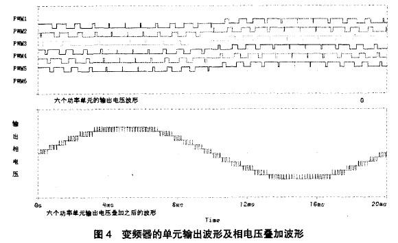每个单元输出PWM波,将每相N个功率单元的输出电压叠加,产生多重化的相电压波形,使相电压产生出2N+1个电压台阶,六个功率单元输出的PWM波形及叠加之后的相电压波形如图4所示。