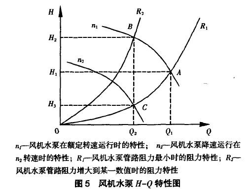 若采用变频调速,风机水泵转速由n1下降到n2,这时工作点由A点移到C点,流量仍是Q2,压力由H2降到H3,这时变频调速后风机(水泵)所需的功率正比于H3与Q2的乘积,即正比于CH3OQ3的面积,由图5可见功率的减少是明显的。