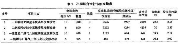 节能型高压变频器在马钢的除尘风机、煤气加压机、供排水等领域得到了广泛的推广应用,节能效果明显,项目节电率保持在20%以上,投资回收期在2~3年,取得了可观的经济效益,通过对高压变频装置投运以来运行情况跟踪,不同场合运行节能实绩如表1。