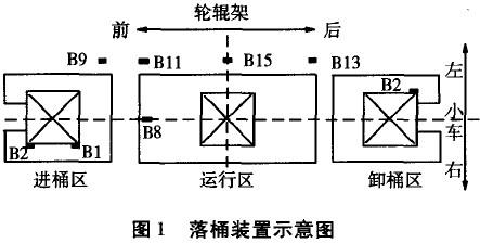 整个生产区域分为三个区:进桶区、卸桶区、运行区。在运行区,小车左右往复运动,B8接近开关是它的行程中心校准点。轮辊前后运动,B15接近开关是它的行程中心校准点。进桶区,空桶用搬运车放至进桶位时,B2接近开关点亮,人桶电机启动,空桶进行至B1接近开关后人桶电机停止。丝束落桶选择的周期时间到时后,小车快速校准于中间位置制动静止;辊轮变速拖动满桶向前运行,到达向前运动设定最远行程后,人桶电机启动,空桶上轮架。轮辊向后运动时拖动满、空两桶,B13光电开关激活时,出桶电机启动,引导满桶至卸桶区。B13光电开关检测到满、空桶两者之间的空隙时,轮辊电机制动开始向后运动。满桶至B3接近开关后,出、人桶电机同时停止运行。一个完整的生产循环周期结束,重新计时开始。