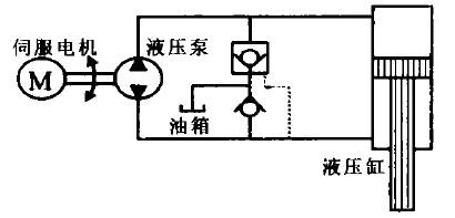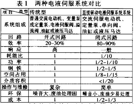 直接驱动电液伺服系统是用交流伺服电动机、可双向转动的定量泵取代了电液伺服系统中的伺服阀和变量泵,交流伺服电动机驱动可双向转动的定量泵, 定量泵直接驱动油缸。通过改变电动机的正反转、电动机的速度、和运转时间来控制油缸的正反向、油缸速度的快慢和位置。直接驱动电液伺服系统的优点在于:1)节能效果显著,有效降低生产成本。直接驱动电液伺服系统避免了节流损耗和溢流、卸荷损耗。而且直接驱动电液伺服系统还提高了伺服电动机的效率和改善功率因数,这是其他液压调速方式无法解决的。2)提高了系统的寿命和可靠性。直接驱动电液伺服系统的液压泵可以选用价格低廉、可靠性高的定量泵,去掉了对环境要求较高的液压伺服元件,从而对传动介质及过滤要求可适当降低。电动机和泵长期在低于额定转速下运行,减少了泵的磨损和系统的噪声,提高了使用寿命和系统可靠性。3)直接驱动电液伺服系统中的电动机与执行元件的油缸可以做到较为理想的功率匹配。油箱的体积也可以很小。4)系统元件数目少,可实现集成一体化,体积小、重量轻、效率高。