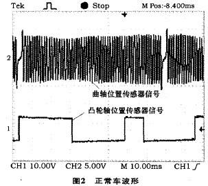 故障分析与测试采用双踪示波器同时测量故障车上曲轴位置传感器与凸轮轴位置传感器的波形如图1所示,在同类型的正常车上测得的凸轮轴位置传感器和曲轴位置传感器波形如图2所示。