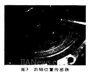故障排除 在更换曲轴位置传感器和凸轮轴位置传感器后都不能解决问题,于是将思路转到曲轴位置传感器的缺口环上来,在图1中凸轮轴位置传感器波形左边三分之一处的波形与其它地方的不一样,更与正常车的波形不一样。传感器没问题,那只有曲轴位置传感器的缺口环有问题了,而且是在与大缺口相距15个齿的位置上。起初怀疑是在第15个齿上有异物,导致传感器信号不好,通过传感器安装孑没能看到有异物,于是只能拆卸油底壳,拆卸油底壳后转到第15个缺口齿位置,如图3中铁棒指示位置的缺口齿环不是有异物,而是有一点变形,变形后导致此位置与传感器的间距变大,以致产生的信号不够强,才产生了不正常的小波形。更换曲轴后此车问题彻底解决。