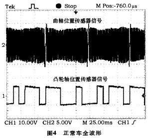 通过图4还能看出曲轴位置传感器波形出现2次才与凸轮轴位置传感器波形重合一次起始位置,这种关系和本车曲轴转速与凸轮轴转速比为2:1的关系一致,也正好是1缸上止点的位置,也就是1缸点火正时的基准位置,也决定了其它3个缸的点火时刻。此信号传输给脚,ECU就能发出点火信号,起动发动机。否则ECU就不发出点火信号,发动机不能起动。