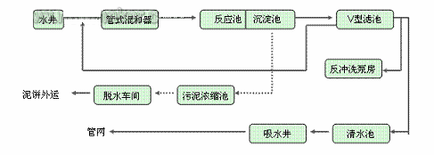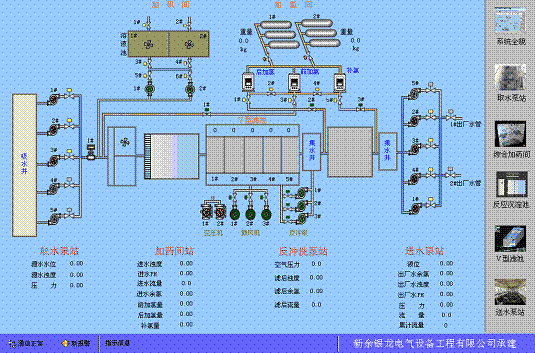 ·监测整个生产工艺流程和各细部的动态模拟图形。该系统实现了水厂整体工艺流程、各主要工艺设备运行状态、过程控制及各生产环节生产数据的实时采集与现实。主要流程画面有:取水泵房流程图、加矾间流程图、加氯间流程、反应沉淀池流程、V型滤池流程、公共冲洗泵房流程、送水泵房流程、10kV一次系统、低压系统等画面。实现的工艺生产设备监控功能有:所有被监控设备的运行状态、启停控制、设备与设备之间的连锁控制、工艺参数的设定,以及设备温度、电流、压力、液位、流量等参数的显示、报警、记录、趋势及累积量计算等。