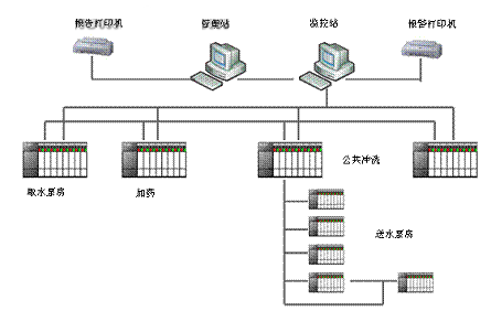 全厂设中控室及取水泵房、加矾加氯间、V型滤池站和送水泵房等4个PLC子站,考虑到系统尽可能分散的原则,在滤池单池设有PLC控制台,具体见下图。