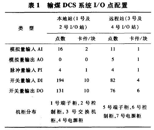 该输煤系统共有8条胶带输送机,4个三通挡板,3台皮带给煤机,4台振动给煤机,2台环锤式碎煤机,2台波动筛煤机,8台振动防闭塞装置,4台带式除铁器,30台犁煤器,2台皮带秤,1套原煤采制样装置等,共计70台(套)设备。根据上述设备,I/O总测点数约为515点(其中远程I/O为174点),实际配置776点(其中远程I/O配置为248点),具有20% 以上的冗余量。具体配置情况见表1。