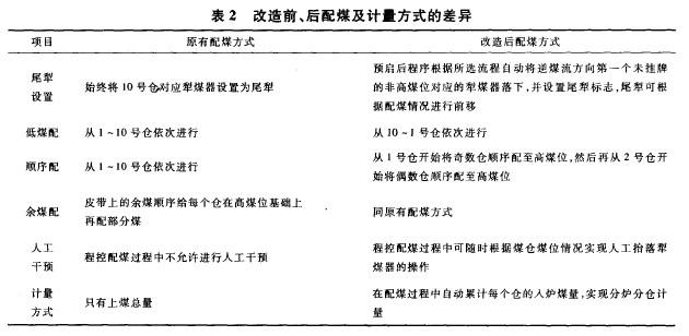 配煤控制方式分为“程序配煤”及“手动配煤”两种方式。“程序配煤”又分为低煤配、顺序配和余煤配3种。在“程序配煤”方式下,首先进行低煤配,然后进行顺序配,再进行余煤配。在整个程配过程中,可根据实际情况随时通过“配煤复位”和“双犁重配”按钮对配煤过程进行干预,也可在“手动配煤”和“程控配煤”之间进行切换。表2列出了改造前、后的配煤及计量方式的差异。