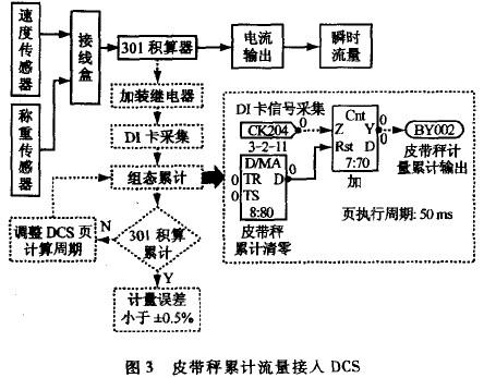 301积算器在每增加1 t累计时内部固态继电器有一个脉冲输出,利用该特点通过加装继电器。在DCS中对采集到的煤量进行.累加就得到了累计流量(见图3),其中虚框部分为组态和加装部分。