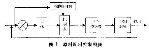 在本系统中回路控制较多。主要有原料配料控制、窑尾喂料量控制、窑头喂煤量控制、分解炉温度控制、增湿塔回水控制、篦冷机风机阀门控制等。其中原料配料采取基于模糊PID的前馈控制,原料配料系统由四台定量给料机(石灰石、硫酸渣、砂岩和粉砂岩)及相应的板式给料机组成,单个控制回路的控制框图如图1所示。