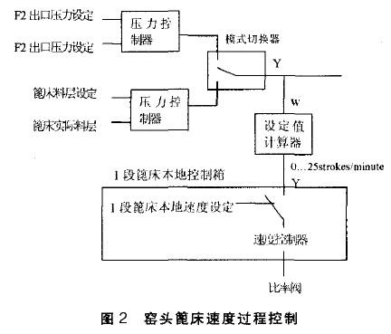 该项目采用德国CP公司的篦冷机系统,根据外方专家的要求和现场的实际情况将窑头篦床速度的过程控制设计如下:在自动状态,设定值W 正常情况下为来自料层控制器的输出,当料位传感器出现故障或信号出现干扰的情况下,利用模式切换器将控制信号切换为压力控制器的输出,W 经设定值计算器乘以相应的比例系数后送给各段篦床的速度控制器,从而控制整个篦床的速度。其中压力控制器、料层控制器和速度控制器均为带阈值判断的PID控制器。