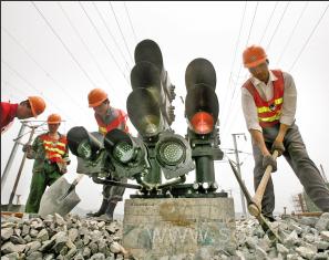 记者昨天在甬台温、温福铁路温州南站建设现场看到,一基基间距约50米的白色柱子整整齐齐地排在铁轨边,把几根导线“牵”向远方;不远处的一个列车运行信号灯已经亮起红灯和绿灯。