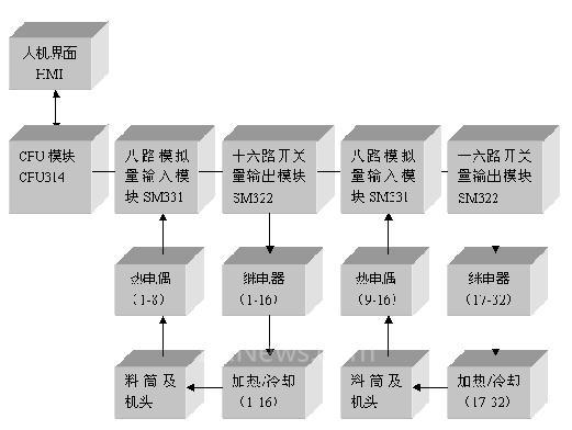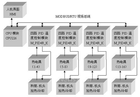 以多回路PID温度控制智能模块为核心,匹配低级别PLC构建塑料挤出机温度控制系统是一个多温区控制的理想方案。系统硬件配置图如图2所示:
