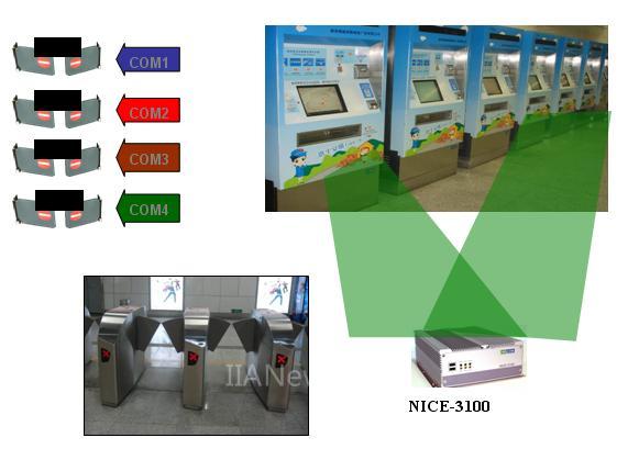该系统由自动售票机、自动增值机、自动兑币机、自动验票闸道机组成。而在自动检票闸机系统中,需要多串口应用,例如车票自动吞吐口、非接触式IC卡、用于显示提示信息的显示频、阻挡装置控制器、中心控制器、报警器等等,同时需要网口、USB接口与系统终端进行信息通讯。REMO-3100控制主机及其他辅助连接设备。