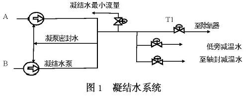 凝结水系统的主要功能是将凝结水从排汽装置凝结水箱送到除氧器,如图1所示。本系统设有2台100%容量、电动定速、立式筒袋型凝泵,布置在汽机房零米以下的凝泵坑内,正常运行时,一台泵运行,另一台备用。凝泵轴封的密封水自泵出口压力管上接出,经截止阀、止回阀和节流孔板后分别接至每台泵的密封水接口,密封水压力为0.4~0.6MPa,温度≤73℃,流量0.3~0.6m3/h。初始密封水来自凝结水输送泵出口管路,凝结水系统还提供各种低压减温器喷水,如:汽轮机低压旁路减温器喷水、本体疏水扩容器减温水、低压缸喷水、水幕保护喷水等。凝泵工频运行时,除氧器水位由凝结水主管路上的调节阀T1调节,凝泵出口压力保持在3.0~4.07MPa。