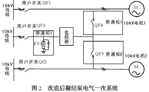 考虑2台凝泵平时一用一备,所以采用单台变频器供2 台凝泵电机,即“一拖二方案”[1 ] 。并增加几个旁通开关,如图2 ,变频器为东方日立公司生产的高压变频器。