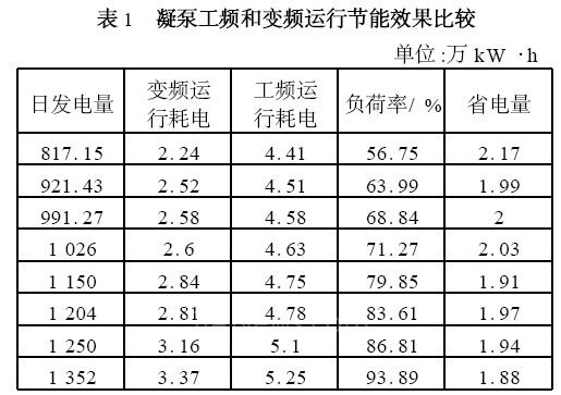 工频运行时,凝泵日耗电量为4.9万kW·h,变频运行时,凝泵出口压力控制在1.9~2.0MPa,每天的耗电量如表1。