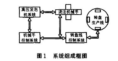 由图可知, 机械手控制系统是整个汽车仪表板生产线的核心, 它主要完成高精度的定位控制、与上位机通讯、数据采集、故障报警, 以及控制发泡机高压循环及浇注时间, 接收来自转盘线的速度信号以适应转盘不同运行方式。高压发泡机系统主要完成ISO (异氰酸酯)和POL (聚醚多元醇)2种发泡料的流量、压力调节及原料循环控制。转盘控制系统主要完成转盘速度调节及模具开合控制。