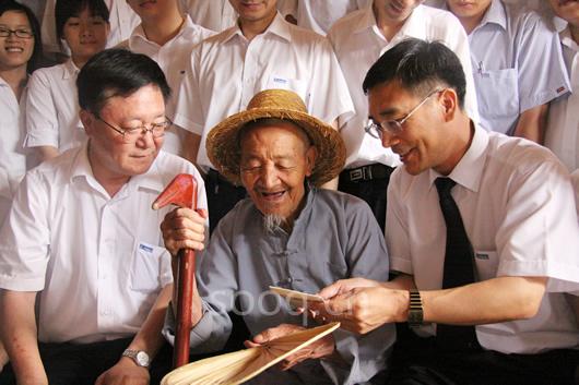 永嘉县五尺乡五尺村,曾是中国工农红军第十三军的摇篮,在这块英雄的土地上,许多革命先烈为了新中国的成立,不惜抛头颅、洒热血。因此,每逢党的生日来临,叶玉森总经理总要率领人民电器的党员踏上这块英雄的土地,看望健在的老红军们。这次,叶玉森总经理率集团办公室主任黄虹宾、集团总工程师吴爱新、浙江分公司常务副总经理朱志金、浙江分公司办公室主任刘忠杰等70多名党员、预备党员,特地来到了红十三军唯一健在的老红军战士胡玉炊的家。握着老红军的手,叶玉森总经理递上了1000元慰问金,代表人民电器真诚祝愿他健康长寿。已有101岁的老红军胡玉炊,耳朵虽然不能象年青人一样好使,但看着大家一个个围在他的身边,他慈祥地笑了。他一边和大家观看反映当年红十三军如何在枪林弹雨中不断成长的纪录片,一边说起了他曾在1929年那一场战斗中大腿受伤的经历。