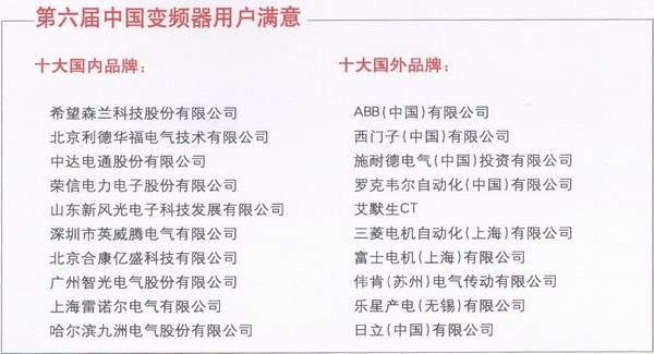 随后举行了年度十大品牌评选结果揭晓和颁奖仪式。据了解,秉承“技术入手 理念先行 你我携手 共同节能”的创始理念,“节能创想2009”于2008年7月启动,经过近一年的有奖征文和用户调查,结合专家意见和编辑推荐,最后评选出国内外十大品牌。主办方在现场发布了“中国变频器用户调查报告”,揭晓了“第六届中国变频器用户满意十大国外品牌”、“第六届中国变频器用户满意十大国内品牌”的获奖名单,森兰荣登榜首、利德华福和中达电通(台达)分别名列第二和第三。