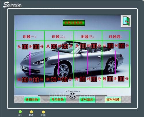 参数设置主要分为通用参数,常用参数,定时温度以及定时时段几个画面。通过这几个参数设置画面,可把各个时间段的温度以及每个时间段的轮换时间传送到PLC自动控制各个时间段的温度变化。下图为定时时段参数设置画面: