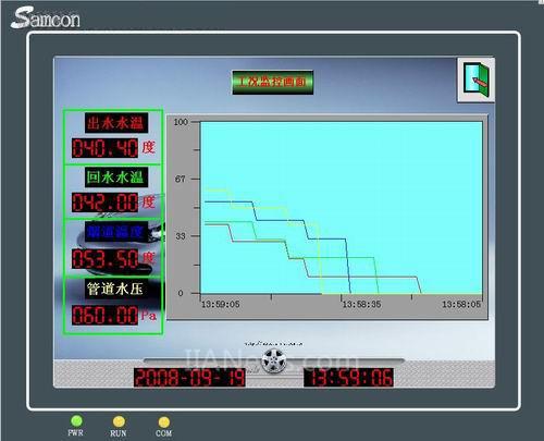 在工控监控画面,可随时监测出水温度,回水温度和烟道温度的当时值以及水压当时值等。