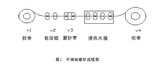 在不锈钢的加工过程中,它的磨砂和清洗工艺是否先进对产品品质起着决定性的作用,系统一般由以下部分组成:放卷、收卷由两台5.5KW电机驱动,压辊、磨砂带各由1台2.2KW电机驱动,四个动力点的速度都由同步控制器输出0-10V信号,控制变频器同步运行。不锈钢板从放卷电机开卷,经前整压辊引入进入生产线,通过磨砂带的高速旋转打磨抛光,进入到清洗水箱进行液体喷射清洁、高压风机干燥处理后,由收卷电机进行收卷、包装。
