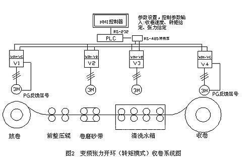 2、张力开环控制方式(转矩模式)。变频器工作在闭环矢量方式下,系统须安装旋转编码器。控制系统简单,无需张力反馈装置,即可获得稳定的张力效果。这种控制方式适合在较低速度下的大张力控制,本文所要介绍的就是此种张力控制方式。