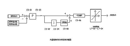 a、力矩限制功能:在PG矢量控制方式下,力矩限制功能的典型应用是开环力矩限制收(放)卷功能。力矩指令可以由多功能模拟量输入端子、ModBus通信卡修改L7组相应参数或通过操作键盘修改L7组相关参数等输入信号任意设定。当不想在负载上施加一定量以上的力矩及不想发生一定量以上的再生能量时,可以使用力矩限制功能。力矩限制的精度:在输出频率10Hz以上时,为±5%,10Hz以下时精度较低。电机输出力矩达到力矩限制值时,力矩控制优先,电机的转速控制和补偿都无效。应该注意的是会出现加减速时间增加及转速降低的情况,而转速降低正是收卷时所需要的特性。矢量控制时的速度(ASR)是把速度指令和速度检出值(PG的反馈或者速度运算值的偏差)调为零,来控制力矩指令。