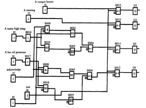 为了确保氧化装置氮气压缩机C一830A/B的正常运转,不影响氧化装置的生产,组织力量对氮气压缩机C-830A/B的报警指示盘做了改造,利用5个sI—EMENS的可编程继电器LOGO!,按照工艺生产要求自行编程、安装、调试。经过实验和工艺人员确认,完全符合原设计要求,为氧化装置生产的安全、平稳、高效奠定了基础。整个系统共包括输入点24个,输出点21个,部分示例如:
