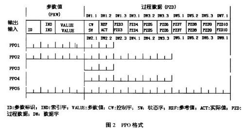 网络组态及参数设置是在西门子公司STEF7编辑环境中进行的。首先在SIEP7中导入ABB公司提供的GSD文件,然后在STEP7中把对应的ABB变频器模块直接拖拽到Profibus—DP网络上就可以了。接下来要对变频器进行参数设置。对变频器参数的设置是在ABB公司的DriveWindow2环境中进行的,该环境不但能对变频器运行参数进行设置,还能控制变频器的运行及对各运行参数进行监控。在变频器需要设置的参数中,很重要的是对通讯协议的设定。Profibus—DP通讯协议的数据报结构分为协议头、网络数据和协议尾。变频器通讯协议网络数据部分符合PROFIDrive行规规定的PPO(parameter process object)变频传动通信对象。PPO有五种格式[4],如图2所示。