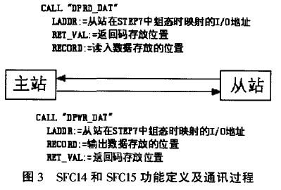 在完成硬件连接、组态后,要想使系统间能通讯,只需对CPU315—2DP进行编程。对于Profibus—DP网络的数据传输,可以采用两种方法进行编程:一是利用LPIBx(PIWx),TPIBx(PI.wx)命令进行数据的接收与发送,但是这种方法只适合4个字节以内的数据传输[3],二是利用S3ZP7中的系统功能块进行编程,该方法可以进行大数据量的传输。STEP7中共有两种功能 块可实现Profibus—DP的数据通讯:FCI(DP— SEND)、FC2(DP—RECV)和SFC14(DPRD— DAT)、SFC15(DPWR—DAT)。本系统在编程中选用了SFCl4(DPRD一DAT)、SFCl5(DPWR一DAT)功能块进行编程。SFC14是从从站读数据,SFC15是向从站写数据,其系统功能定义及通讯过程如图3所示 。