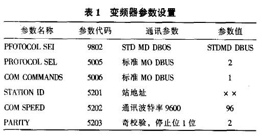 在通信接15与变频器进行通信时,通信接15的参数应与变频器的参数设置相对应。主要设置的参数有站地址、通信速率、校验等,变频器的参数设置见表1。