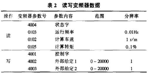 通信接口与变频器之间的数据交换是根据PROFIBUS-DP主站传送的数据长度确定对变频器进行读、写操作的具体内容。这里选择8字节的输入及输出来说明读写操作的具体内容。读操作:当系统为8字节输出时,通信接口需要读取变频器的状态字、运行频率、计算车速、计算转矩。写操作:当系统为8字节输入时,通信接口需要给变频器发送控制字、外部给定1、外部给定2。详细内容如表2所示。
