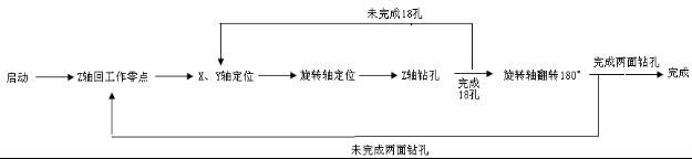 工作流程解析:首先启动有两个按钮,一个是蓝色的,一个是绿色的。蓝色按钮是按同一个序号编码加工钥匙;绿色是按下一个序号编码加工钥匙。按了启动之后,Z轴开始回到工作零点(自定义的),到位后,X、Y轴也开始定位到第一个孔的位置,定位完成,旋转轴旋转设定的角度,完成后,Z轴开始钻孔,钻完一个孔后,X、Y轴继续定位,一直到钻完18个孔后,旋转轴将钥匙翻转180°,然后再重复之前打孔的流程,直到钥匙两面都打了18个孔,X、Y、Z轴回工作零点,旋转轴回到0°位置,钥匙加工完成。