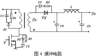 由于开关管和输出二极管的高速开关引起的干扰,可以通过增加缓冲电路来减小。如图4所示: