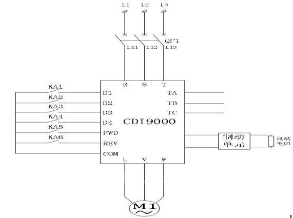 由于提升机电机绝大部分时间都处于电动状态,仅在少数时间有再生能量产生,变频器接入制动单元和制动电阻,就可以满足重车下行时的再生制动,实现平稳的下行。井口还有一个液压机械制动器,类似电磁抱闸,此制动器用于重车静止时的制动,特别是重车停在斜井的斜坡上,必须有液压机械制动器制动。液压机械制动器受原控制系统和变频器共同控制,机械制动是否制动受变频器频率到达端口的控制,起动时当变频器的输出频率达到设定值,打开液压机械制动器,重车可上行;减速过程中,当变频器的频率下降时,表示电机转矩已较小,液压机械制动器制动停车。紧急情况时,按下紧急停车按钮,变频器停机,液压机械制动器马上起作用,使提升机在尽量短的时间内停车。变频器采用多段速度设置,FWD、REV设为正反转,D1、D2、D3设为运行频率6Hz、18Hz、25Hz、35Hz、50Hz,以适应控制系统对提升机不同运转速度的要求。五挡速度加速和减速段的速度均在变频器上设置。变频调速原理图如下图 所示。