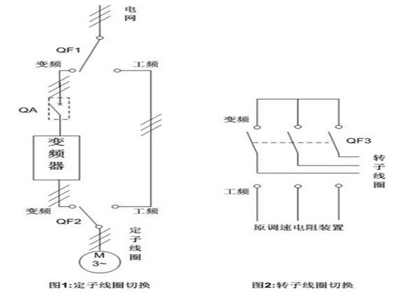 改造提升机用变频器是在原提升机电控系统的基础上,用变频调速系统替代原工频调速系统,同时保留工频调速系统,使两套系统互为备用,增加系统运行的可靠性。改造时需要增加工、变频转换功能。系统运行前,将主回路和控制回路各转换开关切换至相应的变频或工频位置。具体接法如下: