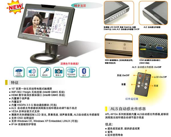 威强的AFOLUX宽屏 10”, 15” 和 19”平板电脑,英特尔凌动处理器无风扇系统,是低功耗嵌入式应用系统的一体化理想选择。高速Intel® GM45移动芯片组为高性能应用提供足够的保证。丰富的多媒体外设,集成三十万像素的摄像头,前面板安装整套数字麦克风和超薄型光驱。