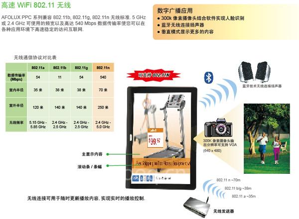 AFOLU平板电脑系列产品兼容802.11b , 802.11g,和802.11n无线标准。5 GHz 或2.4 GHz频率的运行速度下,数据的传输速度高达540 Mbps,并可与高速网络相连接,通过各种接口应用于大环境和小环境。 Intel® GM45 系统的高性能AFOLUX 平板电脑还配备有高清数字多媒体接口( HDMI ),专用于传输无压缩的高清晰数字视频/音频信号。