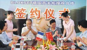 07月07日讯 昨日下午,浙江开关厂有限公司和法国施耐德(中国)有限公司,就低压开关柜达成合作意向,签订合作文书。该公司继去年与瑞士ABB、德国西门子等世界一流的公司合作以来如虎添翼,在国际金融危机下,利润同比仍增长76%。图为该公司董事长蒋善武(右三)和施耐德公司代表在签约仪式上。