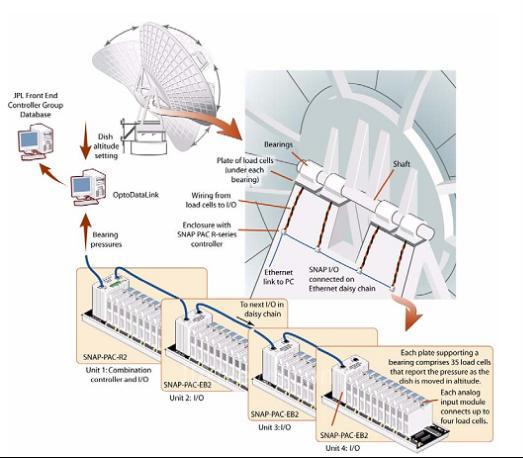 Edwards及其他Opto 22工程师一起为JPL提供了售前咨询,并帮助DSN天线项目制定了要求。他们一同计划了项目使用长距离缆线(约300英尺),4个载荷板/轴承位置设置分布式I/O。Edwards认为SNAP-PAC-EB2处理器能够为JPL提供菊花链状的分布式I/O,集中所有载荷元件读数返回给一个智能控制器,如Opto 22 SNAP-PAC-R2可编程自动化控制器,提供多重连接用于SNAP PAC系统及SQL数据库的数据交互。