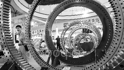 7月8日快讯,第六届亚洲国际风能设备展览会在北京中国国际展览中心开幕,来自22个国家和地区的445家企业同时参展。图为中国大连冶金轴承集团有限公司以庞大的阵容展出大型风能发电机一系列的轴承齿轮,令观众惊叹不已,赞不绝口。
