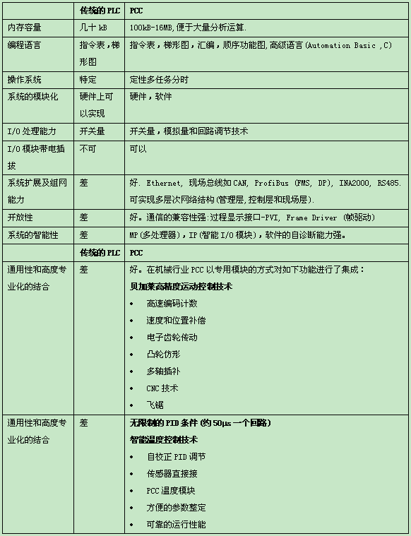 通过以上的讨论,我们对PCC的特点有一个较为全面的了解,在此不妨将其与传统的PLC以表格的形式作一下比较.