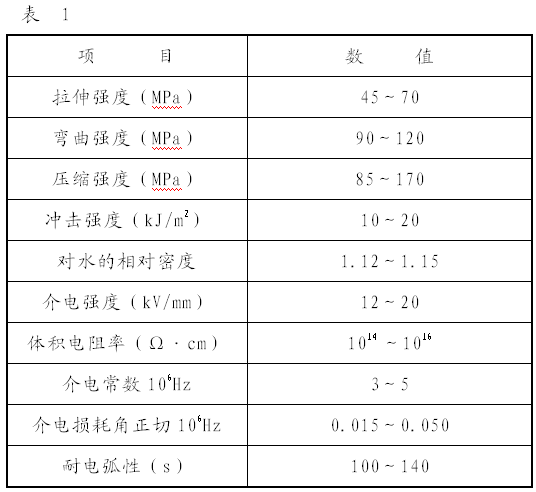 环氧树脂是一种绝缘性能较好的热固性塑料,由于其分子的环氧基极性基因(-CH2—CH-)和羟基(-OH)、醚键(-O-)的粘接力强,机械强度高,有较高的耐寒、耐热、耐化学稳定性,工作温度达到120℃左右。其机械、电性能和其他树脂相比要好,固化后的双酚A型环氧具体性能数据如表1所示: