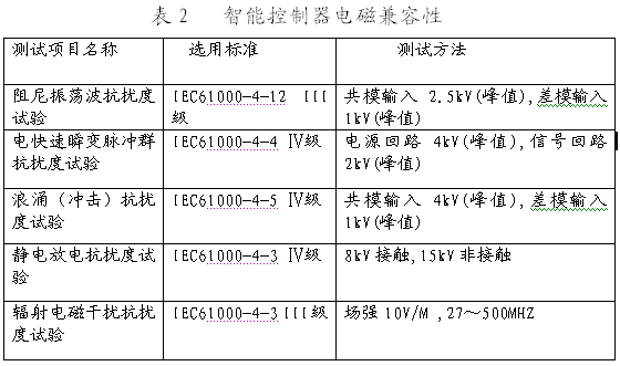 采用高性能的滤波器设计和抗干扰设计就能保证控制器在恶劣的电磁干扰下仍能正确可靠地运行,电磁兼容性符合IEC61000-4-x标准要求。某型智能控制器主要指标如表2: