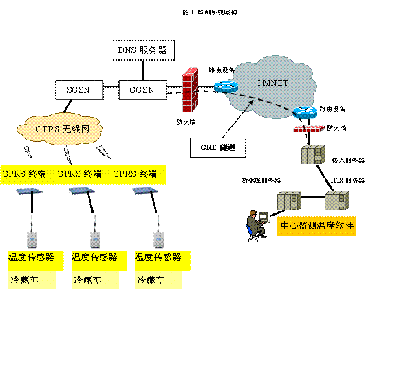 监测中心由功能较齐全的计算机外围设备如显示器、打印机、绘图机等组成。监测现场为各辆冷藏车,温度传感器和GPRS/CDMA无线终端组成。